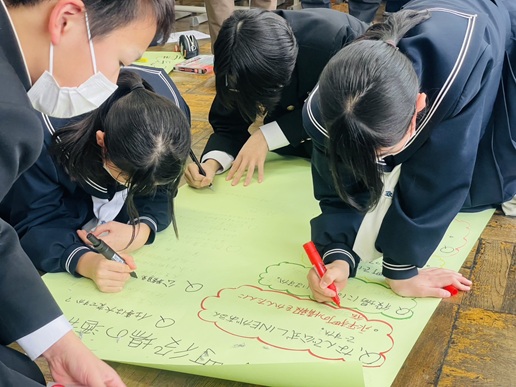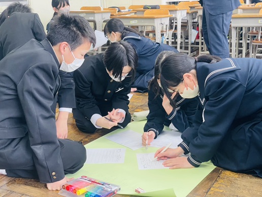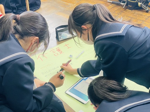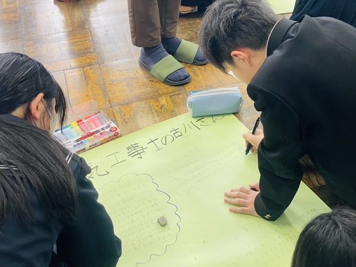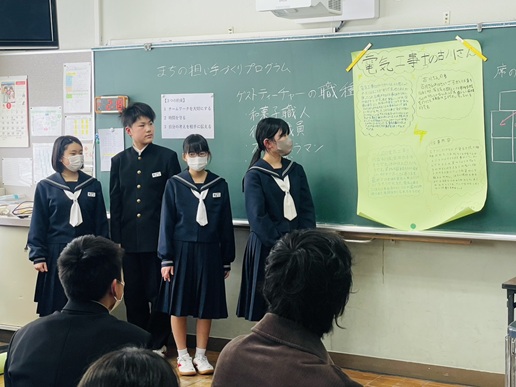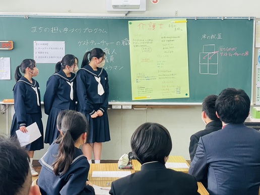 ゲストティーチャーへのインタビューでは、生徒たちに緊張した様子も見られましたが、プレゼンボードの作成では互いに協力しながら意見をまとめていました。発表の時間には、各グループがゲストティーチャーから聞いた仕事内容や「働くことの意義」について、元気いっぱいに発表していました。